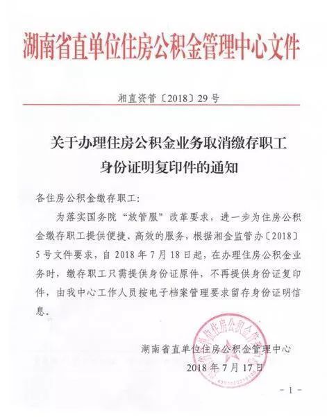 省直单位住房公积金管理中心透露:自本月18日起,缴存职工在办理住房公积金业务时,只需提供身份证原件,无需再提供身份证复印件,由该中心工作人员按电子档案管理要求留存身份证明信息。