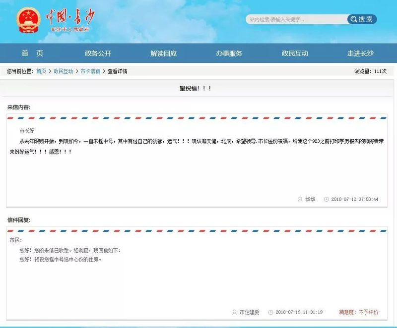 7月12日,有网友因在长沙买房数次摇号不中,在长沙市政府网站市长信箱发文“求祝福”。今天上午,长沙市住建委对该来信内容予以回复。